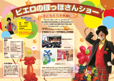 マジック、バルーンアート、ジャグリング・・・なにが飛び出すかはお楽しみ。海外仕込みのピエロ(クラウン)芸を中心に愉快で笑えて楽しめる”マジカルコメディーショー” 約30分